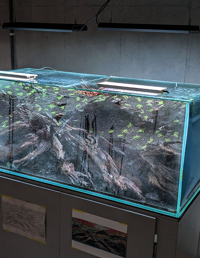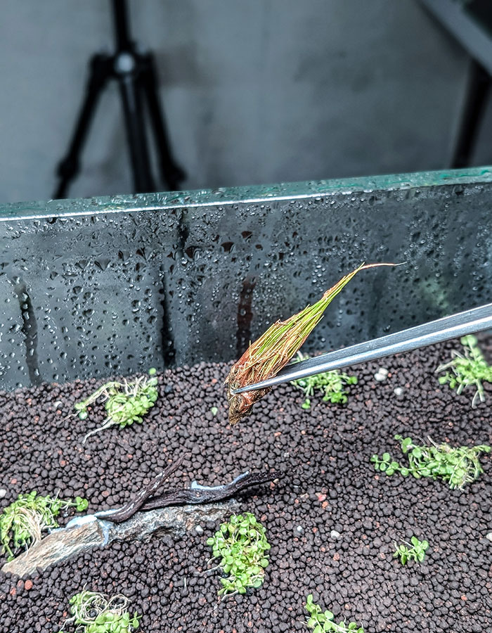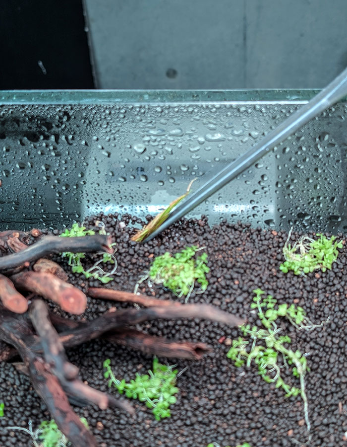水槽内に少し水を入れ、霧吹きで全体的に湿らせます。