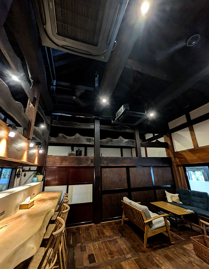 むき出しになった太い梁や柱、高い天井など