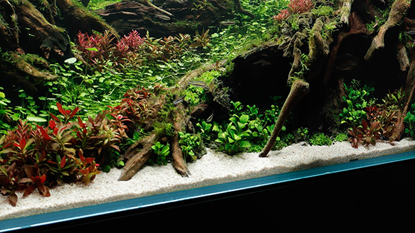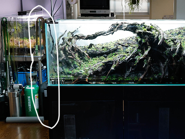 ホースを水槽壁面に向けてレイアウトを崩さないように